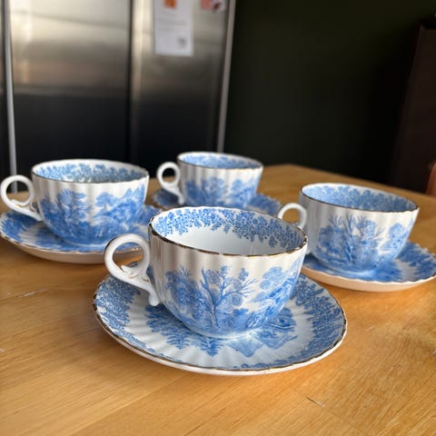 Två stycken kaffekoppar med fat från Arabia. Vitt och blått med gulddekor. Fint skick, inga nagg. Finns i Gustavsberg.