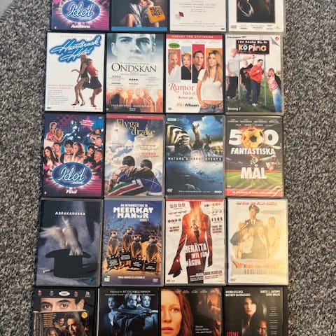 Paket med drygt 200 blandade dvd-filmer i originalfodral. Flera olika genrer syns på bilderna, bland annat action, drama, thriller och komedi. Filmerna är i standard dvd-format. Lämpligt för den som vill utöka sin samling av dvd-filmer med olika titlar och genrer.