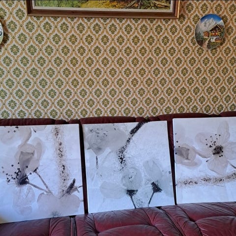 Tavla med motiv av vita svanar och näckrosor mot svart bakgrund. Tavlan är målad på canvasduk 60×73cm. Okänd konstnär från österlen(Skåne).