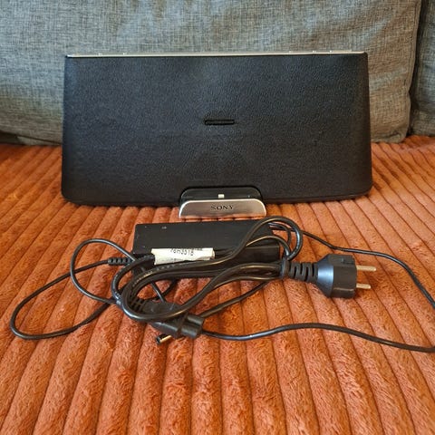 Bose högtalarstation med dockningskontakt för kompatibla enheter. Stationen har inbyggda högtalare och levereras med nätadapter. Passar för uppspelning av ljud från enheter som använder den visade dockningskontakten. Lämplig för användning i hemmet, till exempel i kök, vardagsrum eller sovrum som fristående ljudsystem.