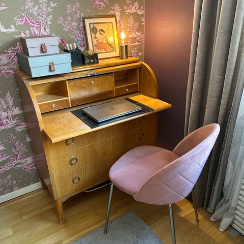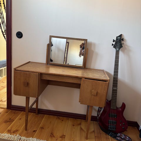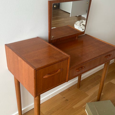 Urgulligt sminkbord teak med tillhörande rosa stol i sammet och spegel. Spegeln kan ställas på skrivbordet eller sättas upp på väggen och sidospeglarna går att vinkla. Skrivbordet är nyoljat med teakolja och har tre lådor. Mått skrivbord: B 88, D 35 och H 74 (132 med spegel). Hämtas en kort promenad från Gullmarsplan. Säljs som paket.