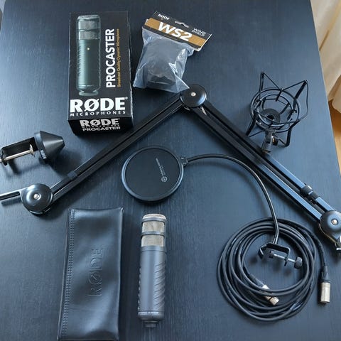 Lewitt LCT 240 Pro kondensatormikrofon i svart utförande. Mikrofonen har stormembran och är avsedd för inspelning av sång och instrument i studio eller hemmastudio. På bilderna syns medföljande skyddspåse, stötdämpande fäste och vindskydd/popfilter. Passar för anslutning till ljudkort eller mixer med XLR-ingång och fantommatning.