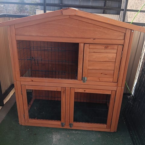 Vi säljer nu vår kaninbur då den har visat sig vara för liten för två mindre kaniner som har stort rörelsebehov.