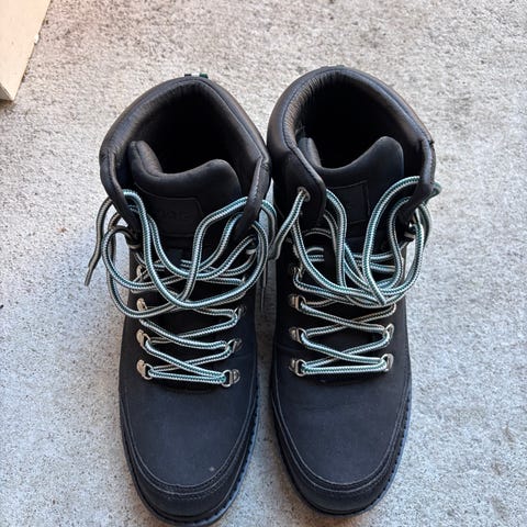 Ganni vinterskor i storlek 38. Svarta kängor med snörning och grov sula. Skorna har varm, ljus fuskpälsfodring på insidan och quiltad detalj vid skaftet. Passar för kallare väder och vardagsanvändning.