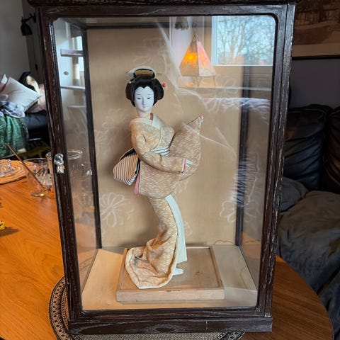 Lackskåp i trä med handmålat asiatiskt landskapsmotiv i guld- och ockratoner på svart botten. Skåpet har dubbeldörrar framtill och flera invändiga lådor för förvaring av mindre föremål, till exempel smycken eller andra accessoarer. Står på integrerad fot/benställning i samma material och färg som skåpet. Dekorationerna visar bland annat pagoder, bro, båtar, berg och växtmotiv.