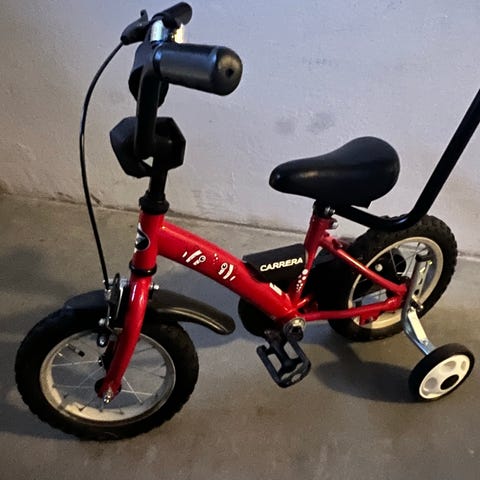 Barncykel med 12" hjul i rosa färg. Passar mindre barn som ska lära sig cykla.