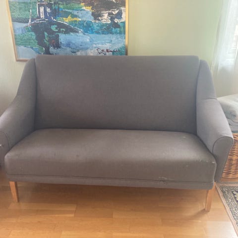 Säljer en vacker röd vintage soffa i klassisk öronlappsmodell med hög rygg och knapptuftning.