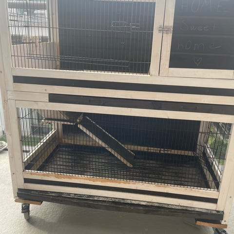 Mått höjd 58cm längd 146cm bredd 97 markram 21 bred runt om för att motverka att till exempel räv gräver sig in. Två grindar, en stor och en liten.