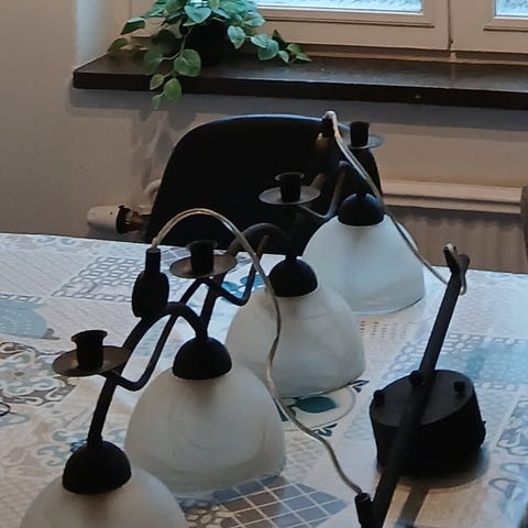 Taklampa med flera armar i metall med borstad finish och vita glas-skärmar. Lampan är avsedd för montering i tak och har fyra ljuspunkter riktade nedåt. Passar till exempel över matbord eller i vardagsrum där man önskar jämn belysning. Strömkabel och takfäste är integrerade i lampans mittdel.