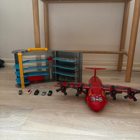 Leksaksfordon och lekset bestående av röd leksaksbil, rött leksaksflygplan samt tillhörande byggnader och tillbehör. Passar för barn som gillar fordonslek och fantasifulla lekscenarier inomhus. Setet kan användas för rollekar där bil, flygplan och byggnader ingår i samma miljö.