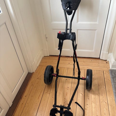 Vagnen är hopfällbar för enkel transport och förvaring. Den har justerbara remmar och avtagbara hjul, fotbroms.