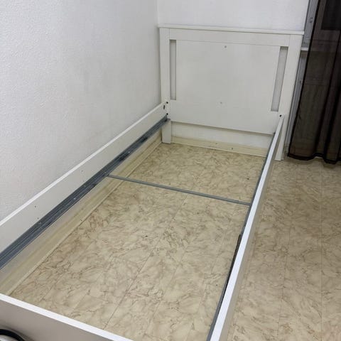 Ramen består av huvudgavel, fotgavel och sidor med metallstänger med stöd för resårbotten eller annan madrasslösning. Två förvaringslådor ingår.