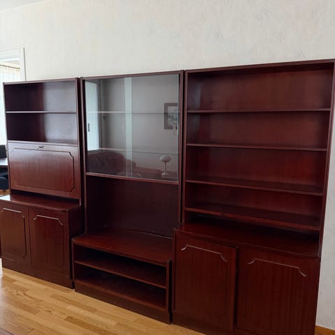 Vitrinskåp och bokhylla i mörkbrunt trä. Möbeln består av flera sektioner med nederdel i form av skåp med dörrar och överdel med öppna hyllplan samt överskåp. En del har vitrindörrar med glas och dekorativa beslag.
