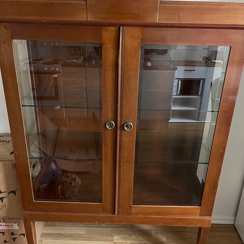 Varje del är 79 cm bred, hyllorna går ta loss från underskåpen.
