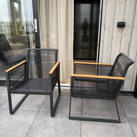Två trädgårdsfåtöljer i svart konstrotting. Stolarna har raka armstöd och hög rygg.