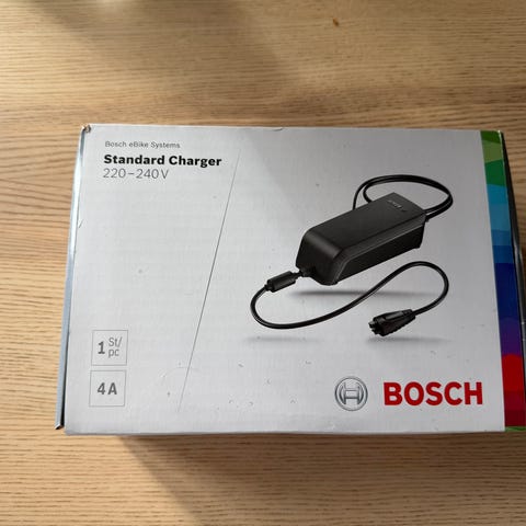 Medföljer gör en Bosch eBike Battery Charger 4A (snabbladdare) med nätkabel. Laddaren är anpassad för Bosch litiumjonbatterier och ansluts till vanligt vägguttag.