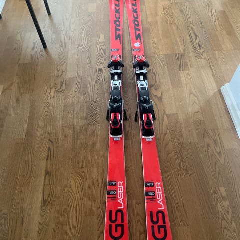 Tecno Pro Team GS slalomskidor i röd färg med integrerade bindningar. Skidorna är utformade för piståkning och har markerade kanter och belag som lämpar sig för preparerade backar. Bindningarna är monterade på skidorna och är justerbara för pjäxstorlek inom angivet intervall från tillverkaren. Passar åkare som söker ett par alpinskidor för användning i skidbacke.
