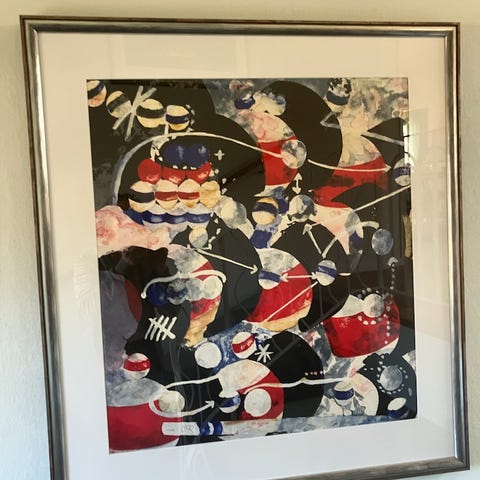 Konstgrafik litografi med geometriskt, abstrakt motiv i två färgvarianter, monterade i ramar.