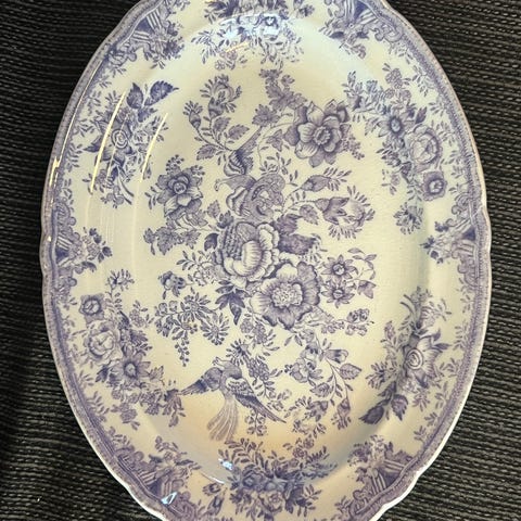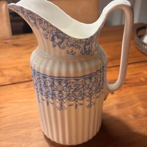 Gustafsberg kanna i porslin i vit glasyr med blå kantdekor. Kannan har markerade rundade fält längs sidorna och ett greppvänligt handtag. Passar för servering av till exempel vatten, saft eller sås. På undersidan finns Gustafsberg-stämpel. En nagg syns vid kanten enligt bild.