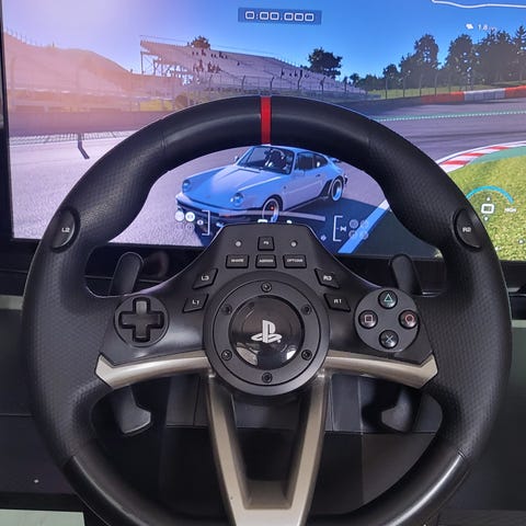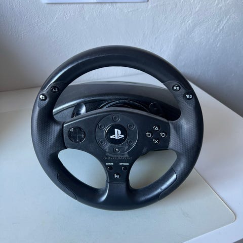 4Gamers PS3 rattadapter för handkontroll i svart plast och metall. Tillbehöret är utformat för att montera en PlayStation 3-handkontroll i mitten av ratten för att ge rattliknande grepp vid bil- och racingspel. Ratten har greppytor i plast och en metallfärgad ytterring. Passar standard PS3-handkontroller enligt bilderna.