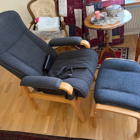 En Hjort Knudsen fåtölj i fint skick. El styrd rygg och uppsittnings hjälp.