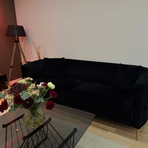 Sofforna kommer i grupp av 3+2+1+1 och är i helt ny skick. 2 dagar gamla. Vi fick inte plats med allt i vardagsrummet och därför säljer vi. Sofforna är i svart färg med mörkgrått på sidorna. Väldigt stabila soffor och går inte sönder lätt. Säljs med alla kuddar på bilden. Materialet är sammet och är mjuk. Priset kan diskuteras!