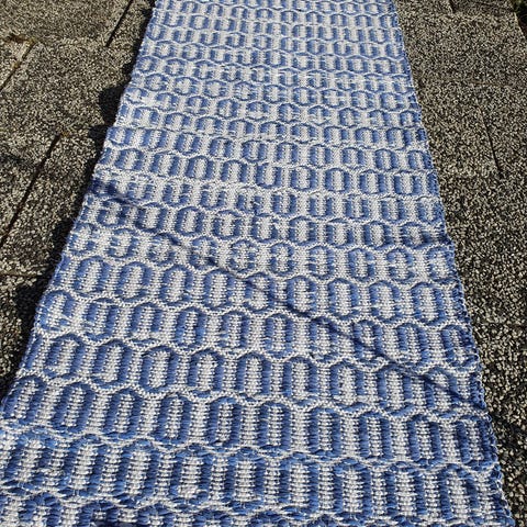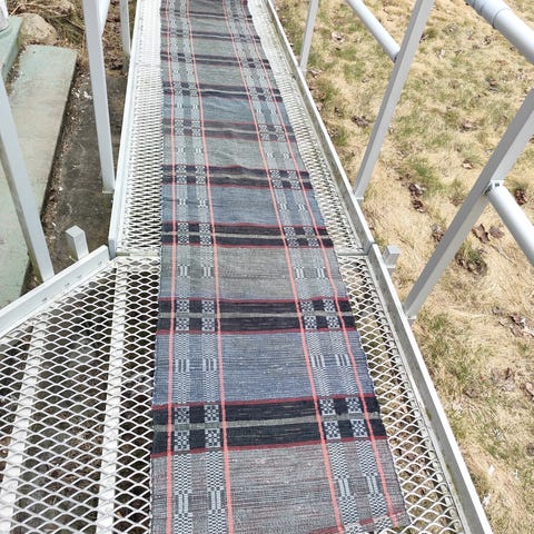 Trasmatta vävd i tuskaft med oblekt och svart varp som gör den randig på längden. Ej använd.