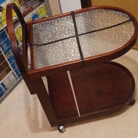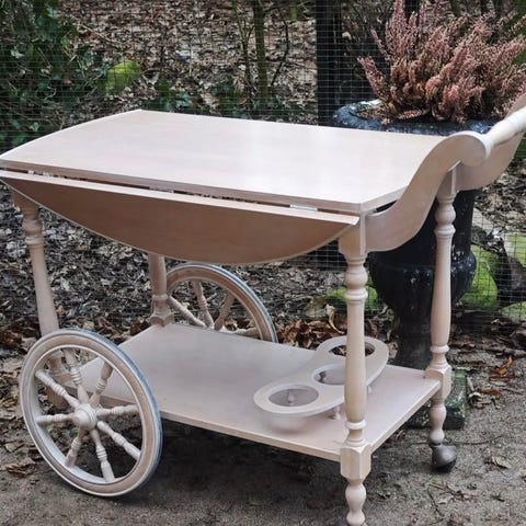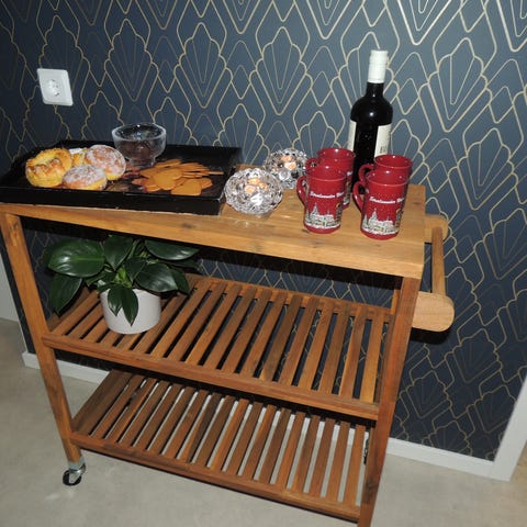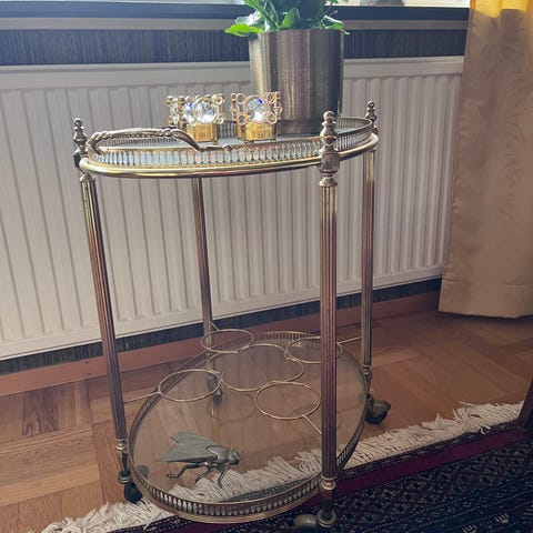 &Tradition serveringsvagn i trä med ovansida i glas. Vagnen har två hyllplan, där det övre är i glas och det undre i trä. Utrustad med hjul för enkel förflyttning och metallstänger som stöd mellan hyllplanen. Passar som serveringsvagn, sidobord eller avlastningsbord i vardagsrum, kök eller matsal.