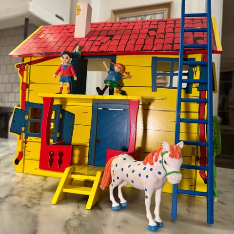 Peppa Pig-skola, lekhus i plast som leksak i mindre format. Huset har gul fasad, blått tak och grön bottenplatta. Insidan är inredd med möbler och detaljer som liknar ett litet rum eller lokal. Öppna sidor och fönster gör det lätt att komma åt att leka från flera håll. Passar som tillbehör i lek med små figurer eller andra leksaksset.