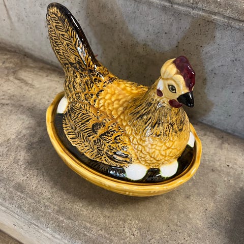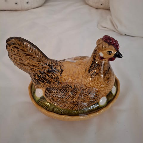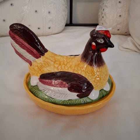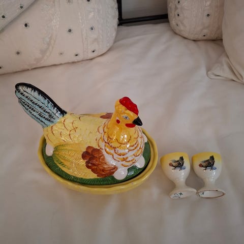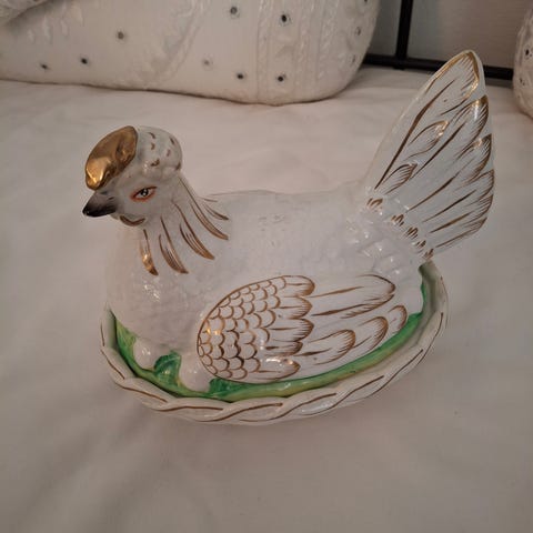Äldre fin ägghöna med 3 äggkoppar säljes. Mått 20 x 15 cm. Pris 950 kr.