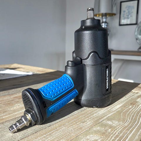 Meec Tools mutterdragare med tillhörande hylsor. I satsen ingår slag-/impakthylsor i storlekarna 17 mm, 19 mm och 21 mm. Verktyget är eldrivet med nätkabel och är avsett för åtdragning och lossning av muttrar, exempelvis vid arbete med hjul och andra fordonsrelaterade uppgifter där mutterdragare behövs.