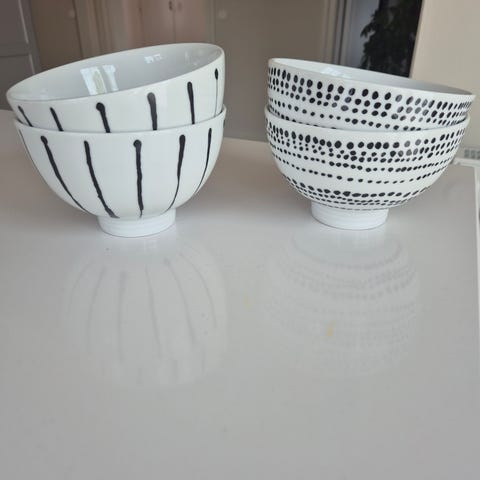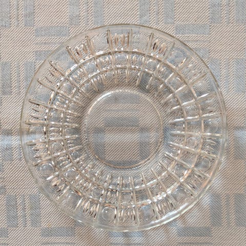 skålar i klart glas. Delarna har dekorativt pressglas-mönster med blommor och geometriska former. Assietterna är runda med markerad spegel i mitten, medan skålarna är ovala med upphöjd dekor runt om. Passar för servering av dessert, fika eller små tillbehör. Alla delar är i genomskinligt glas och ingår i samma mönstrade serie.