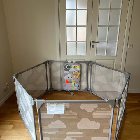 Svart lekhage för barn med mjuk, vadderad madrass i grått tyg med mönster. Lekhagen består av sektioner i metall med spjälor och en öppningsbar grinddel. Formen är flexibel och kan anpassas efter utrymme. Madrassen har uppvikta kanter och knytband för att fästa i lekhagens sidor. Passar för inomhusbruk som avgränsad lekyta eller viloplats för mindre barn.