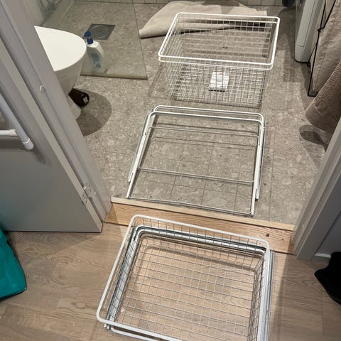 Helt ny utdragsram från Elfa i vitt stål. Köpt i fel storlek och därför aldrig monterad eller använd. Passar perfekt för Elfa Classic-systemet för att montera utdragbara korgar eller hyllplan.