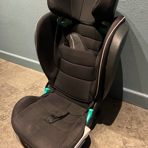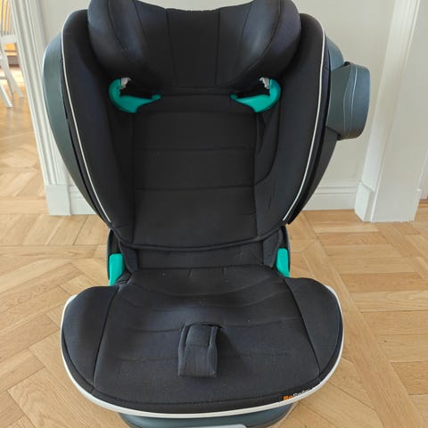 Bilbarnstolen är framåtvänd och har hög rygg med sidokrockskydd. Klädseln är i svart tyg med detaljer i turkos. Sits och rygg är vadderade för ökat stöd och komfort. Stolen har bältesguides för bilens trepunktsbälte samt justerbart nackstöd. Monteras med Isofix och bilbälte.