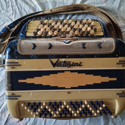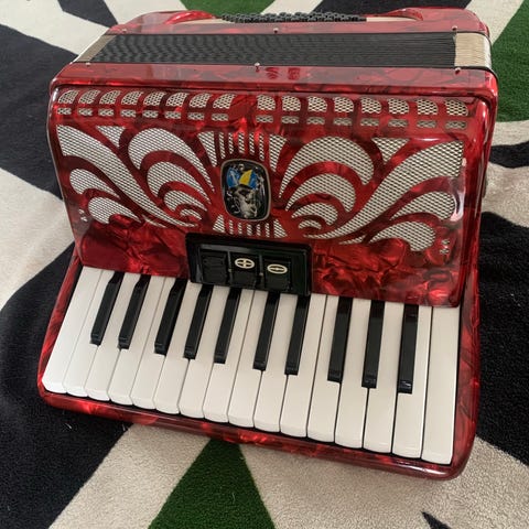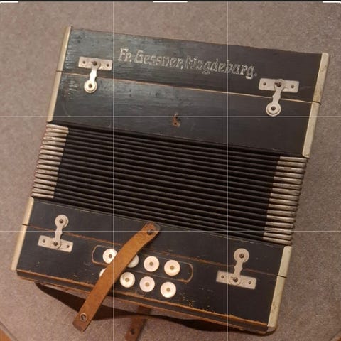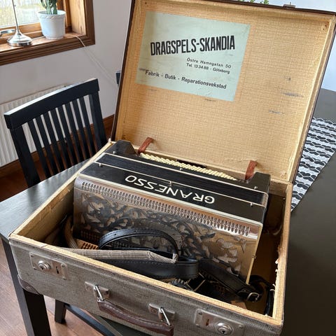 Fr. Gessner dragspel i trä med bälg och knappar framtill. Instrumentet har ett bärhandtag/rem och är utformat som ett traditionellt knappdragspel. Passar för spel i hemmet, vid övning eller som samlarobjekt för den som är intresserad av äldre musikinstrument.