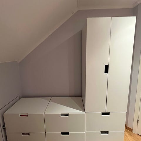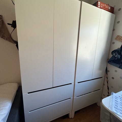Förvaringsmöbel i två delar från IKEA (metod eller bestå- systemet). En del består av två lådor, den andra av ett skåp med luckor.