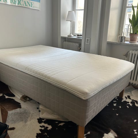 Vit Malm säng från IKEA med resårmadrass Valevåg. Madrassen är 120cm bred och sängramen är något bredare.