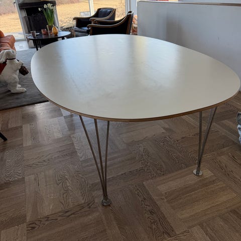 Fritz Hansen matbord formgivet av Bruno Mathsson. Bordet har en vit, mjukt kvadratisk/elliptisk skiva och förkromade metallben med karakteristisk trådkonstruktion. Märkningar under bordsskivan visar samarbete mellan Mathsson International och Fritz Hansen. Passar som matbord eller arbetsbord i kök, matsal eller vardagsrum.