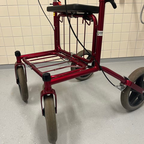 Jag säljer rullator Carl Oskar med stora hjul. En trygg och säker, lättmanövrerad rullator med reglerbara handtag och bromsar (hand- och färdbroms), genomgjutna gummihjul, bred sittplatta samt plats för varukorg. Lätt att fälla ihop. Färg: vinröd metallic.