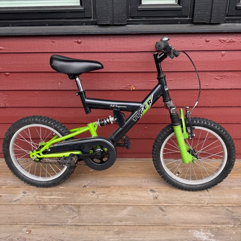 Tuff MTB modell med fjädring fram och bak. Utrustad med hand och fotbroms. Barncykel med 16" hjul i svart och grön färg. Cykeln har rak styre, sadel i standardmodell och grovmönstrade däck. Utrustad med skärmar bak, kedjeskydd och stöd. Passar mindre barn som behöver en cykel i 16-tumsstorlek för kortare turer och lekcykling.