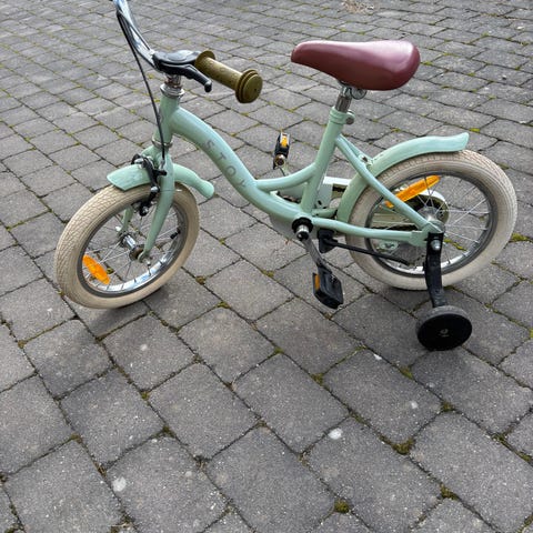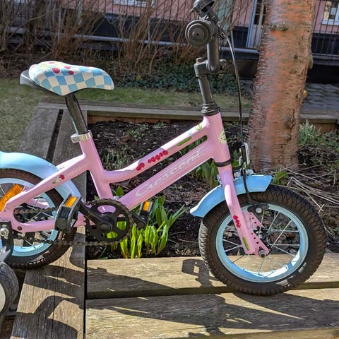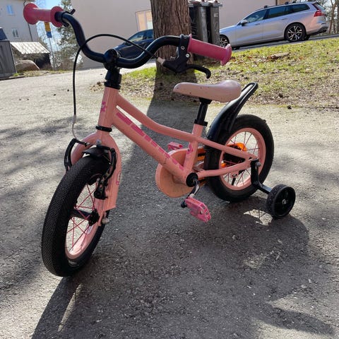 Logan barncykel 12 tum i rosa färg med vita detaljer. Cykeln är utrustad med stödhjul, kedjeskydd, skärmar och framkorg i plast. Sadel och handtag är ljusa med mönster. Passar mindre barn som ska lära sig cykla, med låg ram som underlättar på- och avstigning.