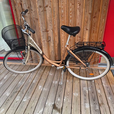 Damcykel i storlek L med 28" hjul (700c). Cykeln har lågt insteg anpassat för kvinna. Utrustad med pakethållare bak och cykelkorg fram. Passar för vardagscykling och transporter i stadsmiljö. Cykeln finns i Hammenhög.