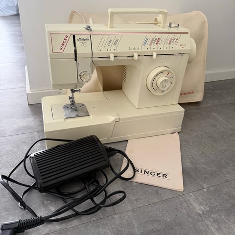 Mekanisk modell med fotpedal och bärbart skyddshölje. Maskinen har reglage på framsidan för olika stygninställningar och är avsedd för sömnad av kläder, hemtextil och enklare reparationsarbeten i hushållet.