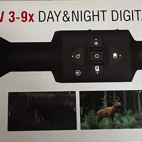 Digitalt kikarsikte med variabel förstoring 3–14x. Siktet har inbyggda reglage på sidan för styrning av funktioner. Levereras i originalkartong. På bilderna syns även en separat lamp-/belysningsenhet med fäste för montering på siktet eller skena. Atn IR850.