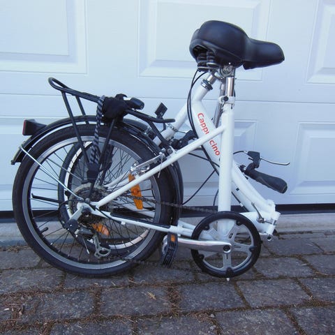 Hopfällbar, delad i mitten samt styret och pedalerna.