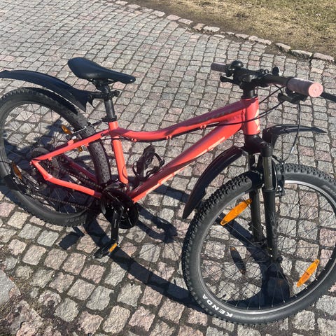 Cykeln är i bra skick och allt fungerar som det ska – växlar och bromsar fungerar fint. Den har hydrauliska skivbromsar och flera växlar, så den fungerar bra både på asfalt, grus och enklare stigar.