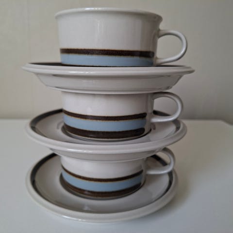 Arabia Kosmos tekopp och kaffekopp med fat i glaserad keramik. Perfekt för dig som vill komplettera din servis. Skick som nya! Pris för bägge kopparna.