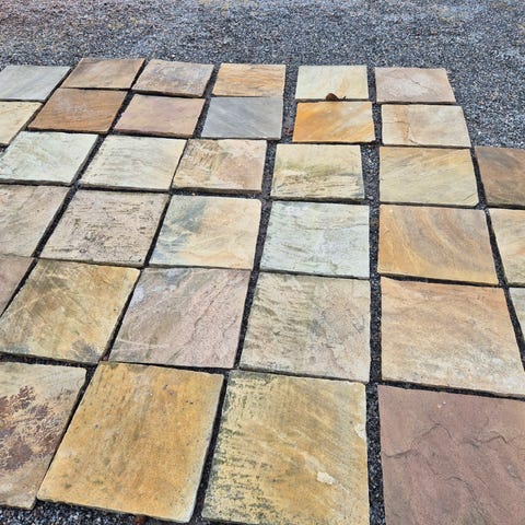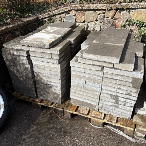 Markplattor i betong med stenstruktur. Passar för exempelvis gångar, uteplats eller andra ytor i trädgård och utomhusmiljö där en hård och stabil yta önskas. Plattorna har en yta med småsten som ger ett rustikt utseende och ger bra friktion vid gång.