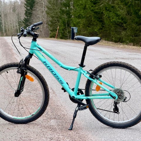 Barncykel med 24" hjul i blå färg samt sparkcykel i svart. Barncykeln har handbromsar, stöd och skärm bak. Sparkcykeln har luftfyllda däck, handtag med grepp och fotplatta. Passar barn som behöver en cykel med 24-tums hjul och en sparkcykel för lek och kortare turer. 1200 kr cykel & 200 kr sparkcykel.